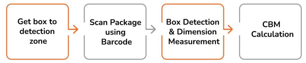 Currently, the box dimensions measurement process is done manually which consumes a lot of time and effort. The length (L), Breadth (B) & Height (H) are calculated in inches/cms. For irregularly shaped boxes, extreme points have to be used for measurement. Multiplying L*B*H gives you the cubic inches of the shipment. This process has to be repeated for all the boxes and at the end adding them all together.