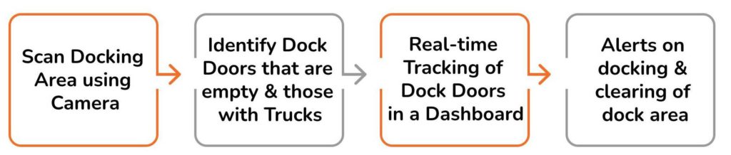 TechVision+ proposes automating the capture of dock door, unloading and loading area availability using AI and Computer Vision and update the details and status events in WMS/TMS using API integration. Also, the tracking event messages can be sent to 3PL’s or Carriers