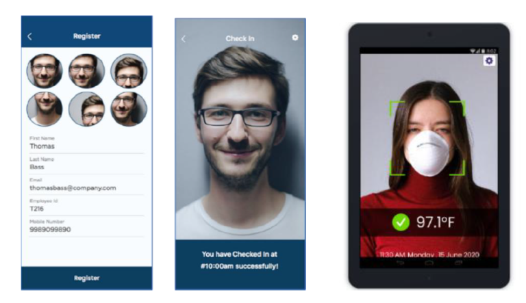 - Face Recognition based access: Employees and visitors can be registered using a mobile app to capture their personal details and facial features. A Tablet setup at the entrance/exit will ensure that facial recognition is done for entering the workplace.